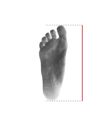 De pie sobre una superficie plana, mida su pie desde el talón hasta la punta del dedo más largo. Mida ambos pies y seleccione la talla en función del pie más grande, si es diferente.